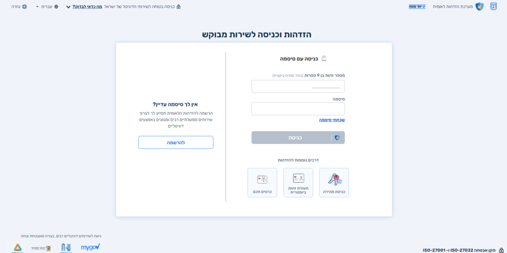 כדי להיכנס, תידרשו להזדהות באמצעות מערכת ההזדהות הלאומית.
