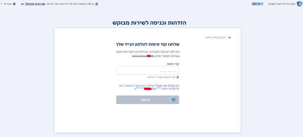 לאחר הזנת פרטי ההתחברות המערכת תשלח קוד אימות לטלפון הנייד שלך – ניתן לקבל את קוד האימות גם לכתובת הדואר האלקטרוני השמורה במערכת
