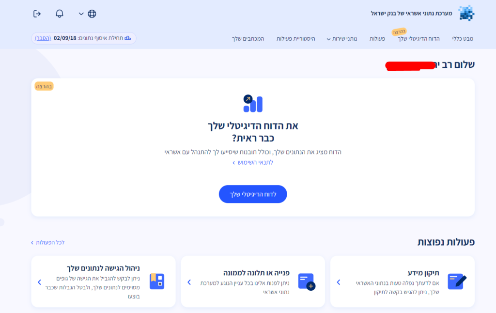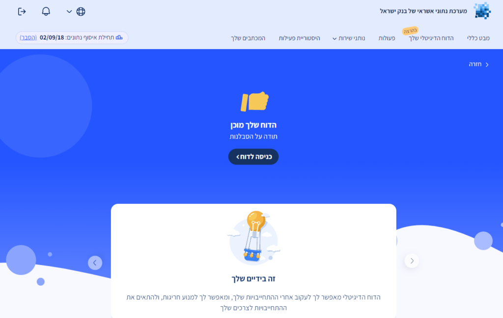 במסך הבא תועברו לצפייה בדוח הדיגיטלי שלך ותוכלו לראות מצב נתוני אשראי, נתוני עו"ש, מסגרת כרטיסי אשראי, משכנתאות, הלוואות ועוד.