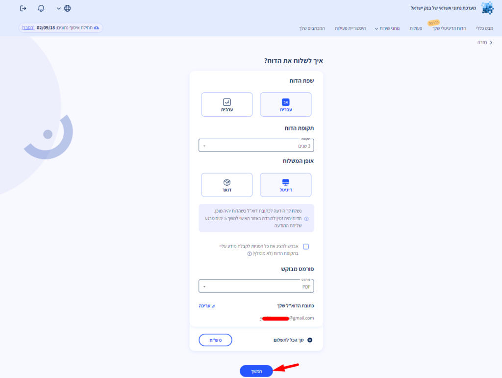 אופן המשלוח – במידה ורוצים את הדוח בדוא"ל אז נבחר בדיגיטל בפורמט PDF ונלחץ על כפתור "המשך".